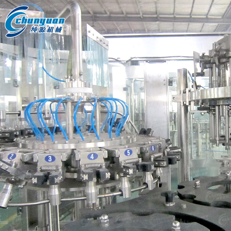 气泡水灌装机采用电磁调速电机经传动装置将动力传到转盘,转盘上装有夹瓶机械手,夹瓶器跟随转盘一起旋转,瓶子在进瓶装置的作用下转至进瓶区,夹瓶器将转入的瓶子夹住,使瓶子转入冲洗区,同时在导轨的作用下自动完成180度翻转、冲洗、沥干等洗瓶工序,然后复位瓶由出瓶拔轮拔出,这样,此瓶就完成了冲洗过程,达到洗净的目的,由输送链送往灌装机。在一机上实现冲瓶,灌装,封盖。整体设计科学合理,外表美观,维修方便,悬挂式卡瓶口输送结构,更换瓶型更方便,快捷省力。主机采用先进的PLC可编程自动控制技术,关键的电器元件均采用国际知名商品的产品。