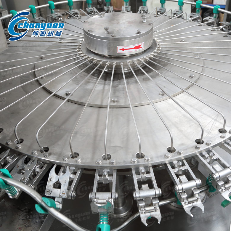 瓶子由通过风送道传递,然后通过拨瓶星轮传送至三合一机的冲瓶机。冲瓶机回转盘上装有瓶夹,瓶夹夹住瓶口沿一导轨翻转180°,使瓶口向下。在冲瓶机特定区域,冲瓶夹喷嘴喷出冲瓶水,对瓶子内壁进行冲洗。瓶子经冲洗、沥干后在瓶夹夹持下沿导轨再翻转180°,使瓶口向上。洗净后的瓶子通过拨瓶星轮由冲瓶机导出并传送至矿泉水灌装机。