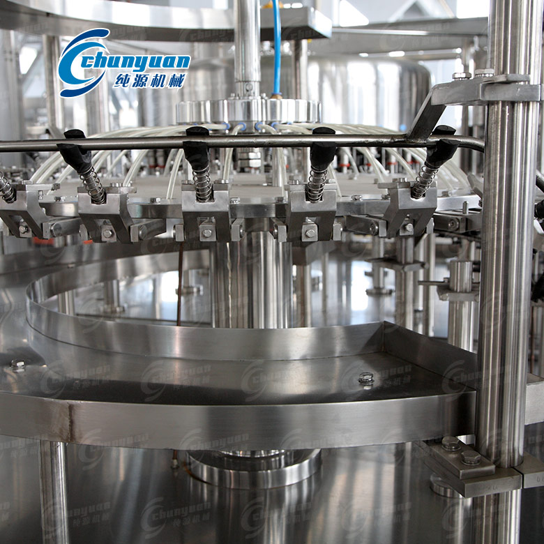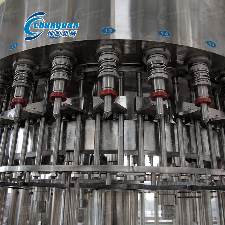 饮用水灌装机进入灌装机的瓶子由瓶颈托板卡住并在凸轮作用下将瓶子上升,然后由瓶口将灌装阀顶开。灌装采用重力灌装方式。灌装阀打开后物料通过灌装阀完成灌装过程,灌装结束后瓶口下降离开灌装阀,瓶子通过卡瓶颈过渡拨轮进入旋盖机。旋盖机上的止旋刀卡住瓶颈部位,保持瓶子直立并防止旋转。旋盖头在旋盖机上保持公转并自转,在凸轮作用下实现抓盖、套盖、旋盖、脱盖动作,完成整个封盖过程。成品瓶通过出瓶拨轮从旋盖机传送到出瓶输送链上,由输送链传送出饮用水灌装设备。