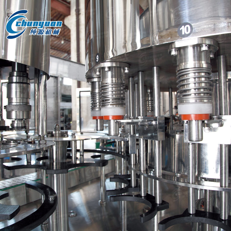 进入水灌装设备的瓶子由瓶颈托板卡住并在凸轮作用下将瓶子上升,然后由瓶口将灌装阀顶开。灌装采用重力灌装方式。灌装阀打开后物料通过灌装阀完成灌装过程,灌装结束后瓶口下降离开灌装阀,瓶子通过卡瓶颈过渡拨轮进入旋盖机。旋盖机上的止旋刀卡住瓶颈部位,保持瓶子直立并防止旋转。旋盖头在旋盖机上保持公转并自转,在凸轮作用下实现抓盖、套盖、旋盖、脱盖动作,完成整个封盖过程。成品瓶通过出瓶拨轮从旋盖机传送到出瓶输送链上,由输送链传送出纯净水三合一灌装机。
