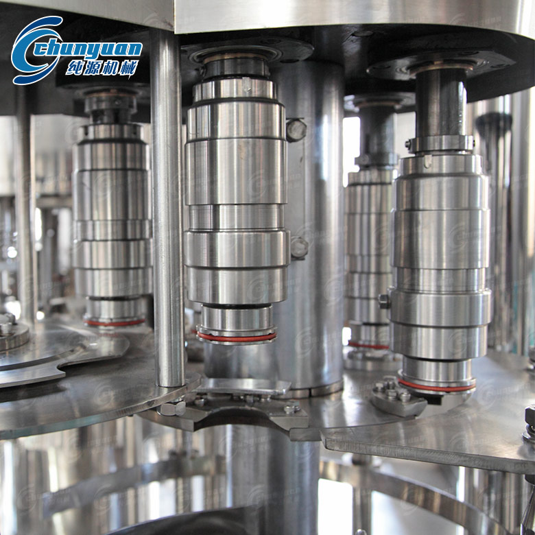 进入纯净水灌装设备的瓶子由瓶颈托板卡住并在凸轮作用下将瓶子上升,然后由瓶口将灌装阀顶开。灌装采用重力灌装方式。灌装阀打开后物料通过灌装阀完成灌装过程,灌装结束后瓶口下降离开灌装阀,瓶子通过卡瓶颈过渡拨轮进入旋盖机。旋盖机上的止旋刀卡住瓶颈部位,保持瓶子直立并防止旋转。旋盖头在旋盖机上保持公转并自转,在凸轮作用下实现抓盖、套盖、旋盖、脱盖动作,完成整个封盖过程。成品瓶通过出瓶拨轮从旋盖机传送到出瓶输送链上,由输送链传送出三合一水灌装机。