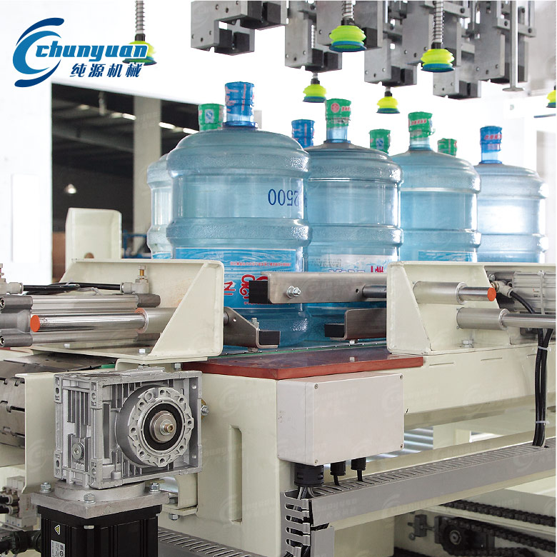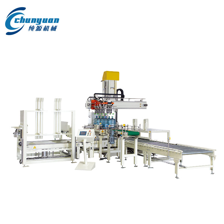 大桶码垛机是将已灌装好的5加仑桶按一定排列码放在托盘(木质、塑胶)上,进行自动堆码,可堆码多层,然后自动输至实托工位,便于叉车运至仓库储存。本设备采用PLC+触摸屏控制,实现智能化操作管理,实现人机对话,可显示生产速度,故障原因及位置,自动化程度高。简便、易掌握,可大大地减少劳动力和降低劳动强度。