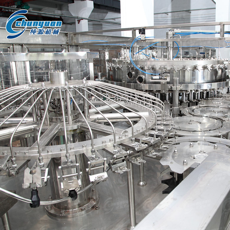 碳酸饮料机械是我国引进德国技术,运用等压灌装原理自行设计制造,实现将液体灌装到由冲瓶机送过来的洗好的瓶子中。
